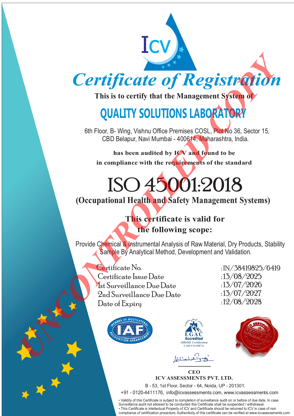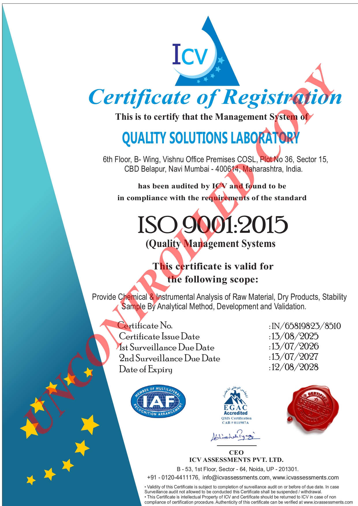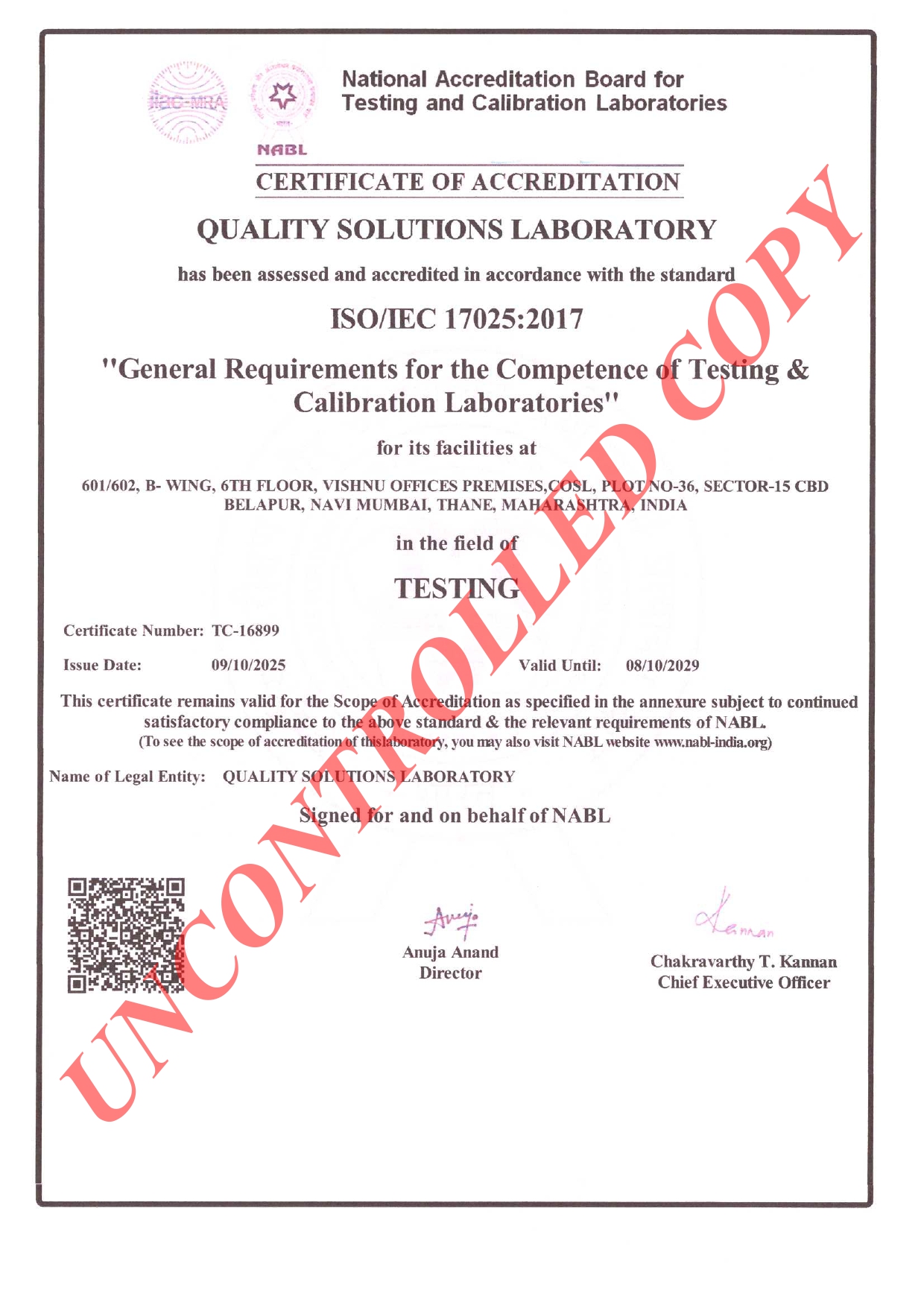 QSL is an MH-FDA, ISO 17025:2017 (NABL) and ISO 9001:2015 certified