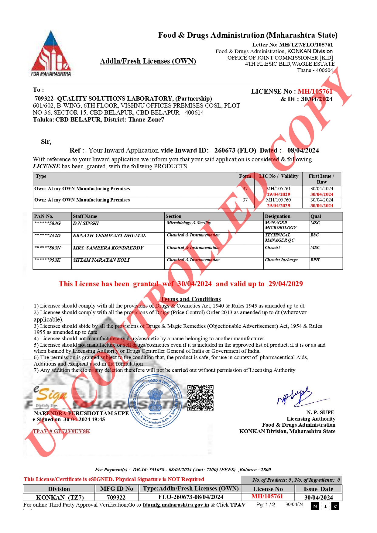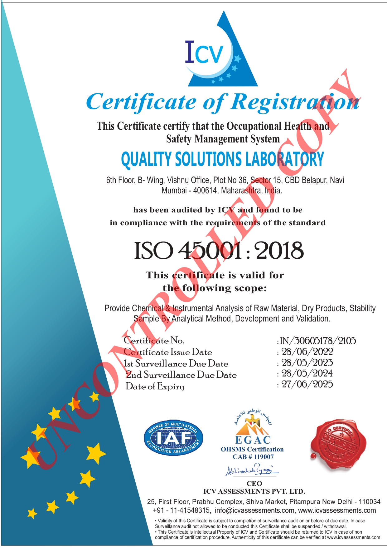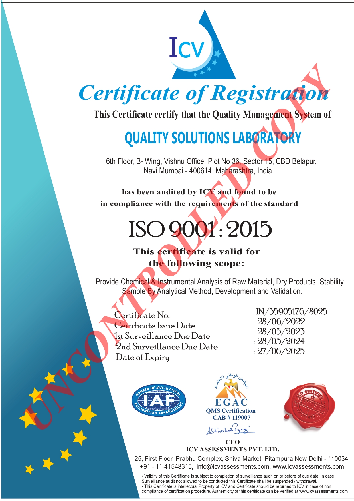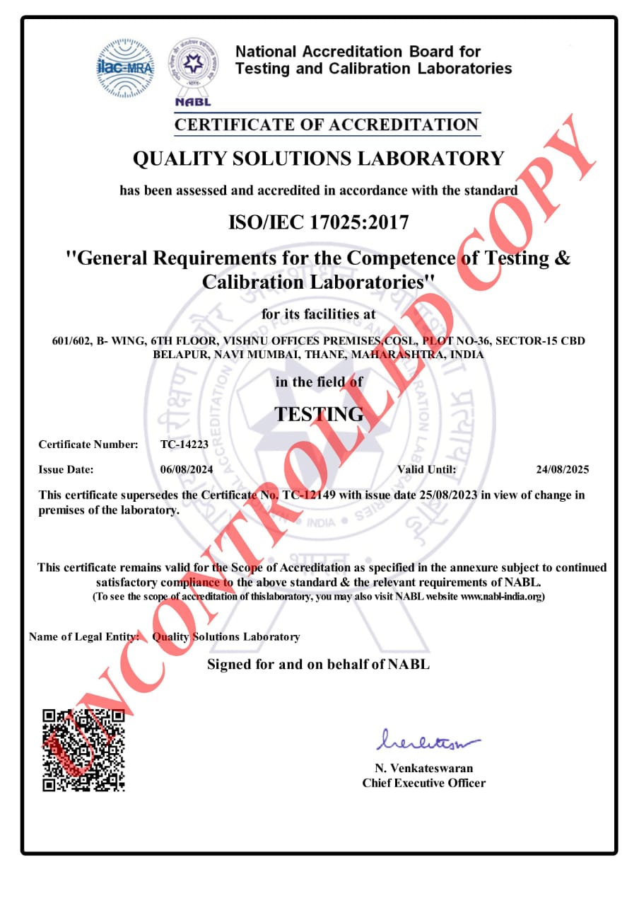 QSL is an MH-FDA, ISO 17025:2017 (NABL) and ISO 9001:2015 certified
